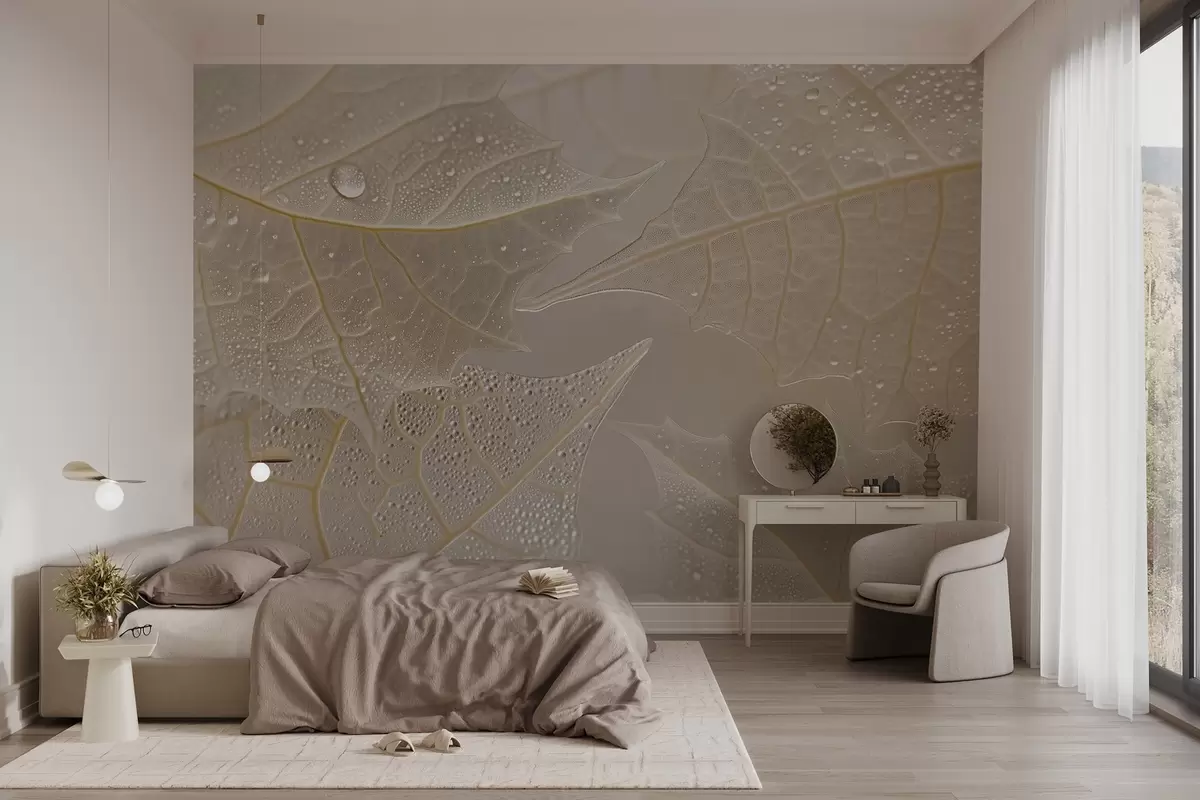 Fototapeta Zbliżenie liści z żyłkami i kroplami rosy w odcieniach beżu Nr w02872