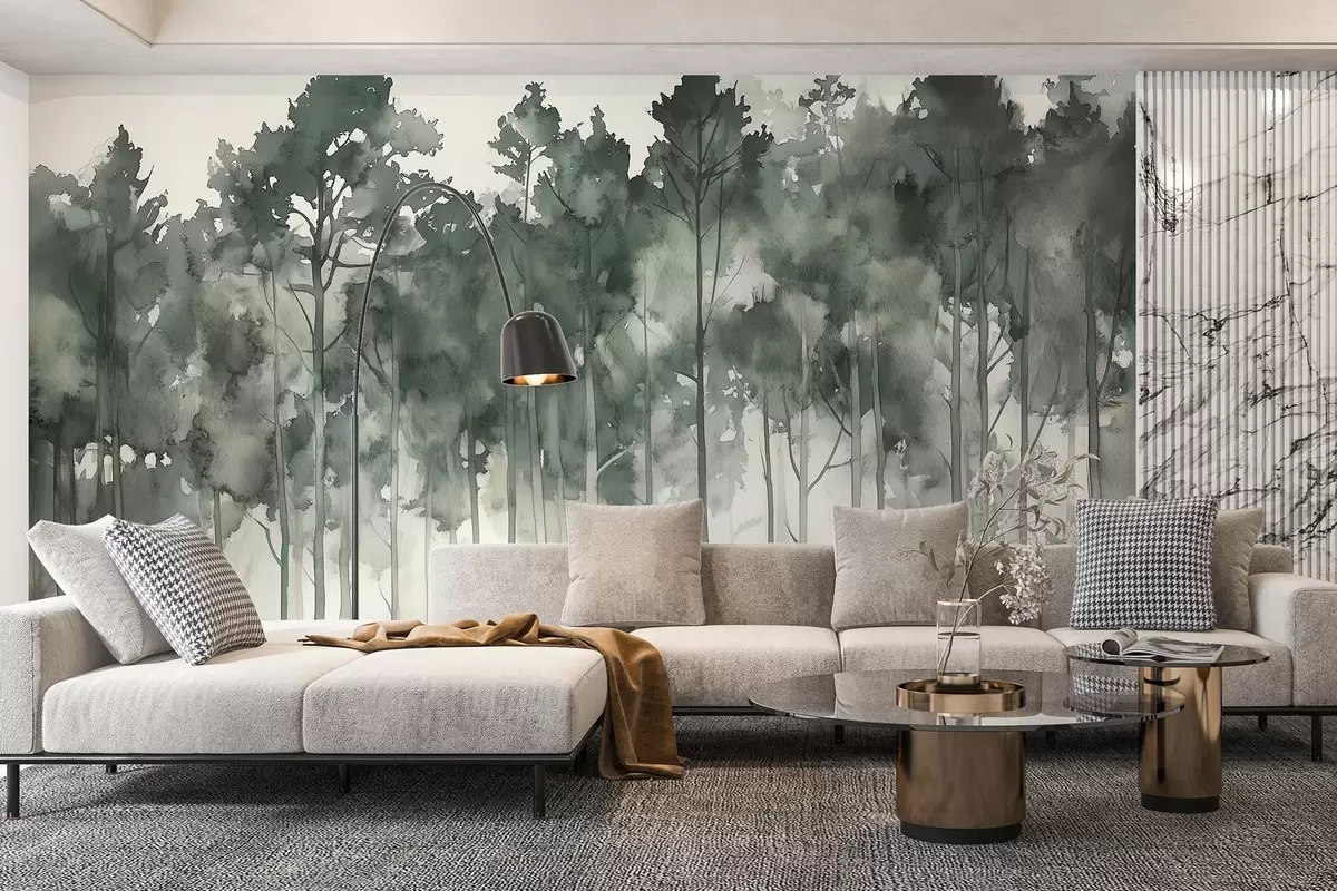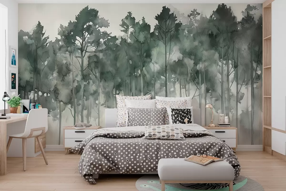 Fototapeta Las w stylu akwareli, sosny, krajobraz natury, zielone kolory Nr w02937