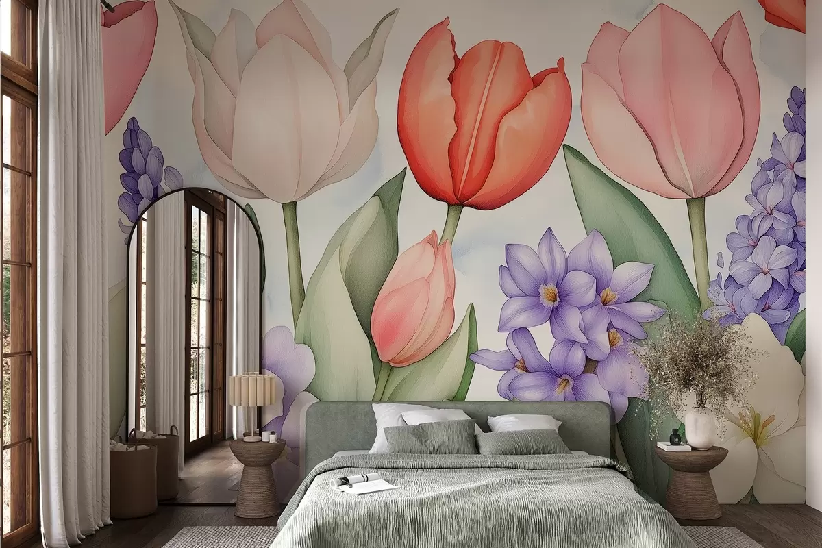 Fototapeta Wiosenne kwiaty, tulipany, hiacynt, rysunek w stylu akwareli, kwiatowy Nr w02940