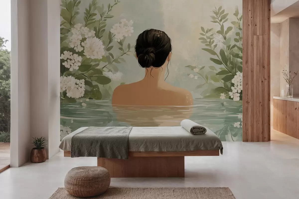 Fototapeta spokojna i marzycielska ilustracja botaniczna przedstawiająca kobietę kąpiącą się w spokojnym, odbijającym światło zbiorniku wodnym, otoczoną bujną zielenią i delikatnymi białymi kwiatami. Nr w03014