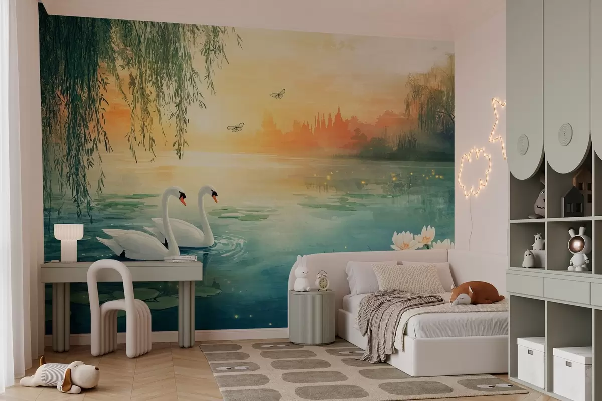 Fototapeta Romantyczny krajobraz w stylu malarstwa olejnego z dwoma białymi łabędziami na jeziorze Nr w03017