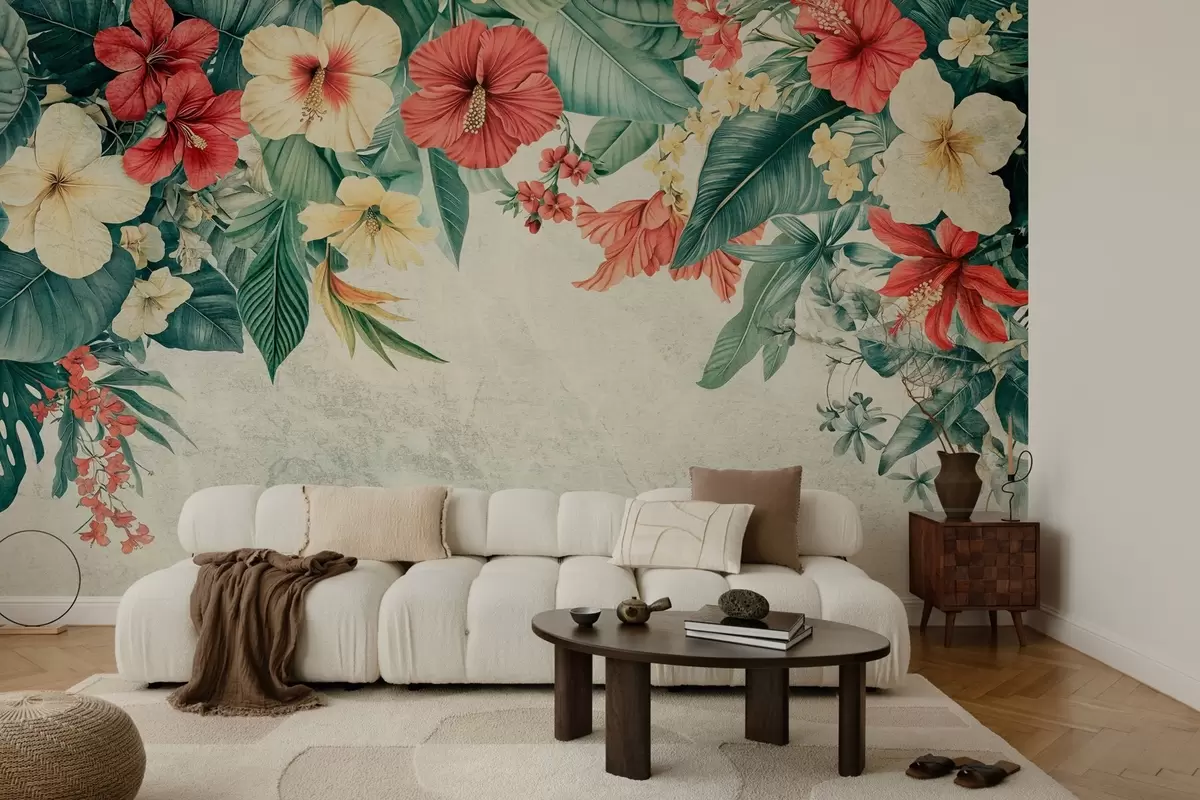 Fototapeta tropikalne kwiaty i rośliny zwisające z góry na teksturowanym tle Nr w03023
