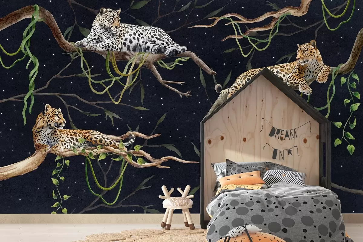 Fototapeta Lamparty na drzewach w dżungli, liany, tropikalne, dzikie zwierzęta, nocne niebo z gwiazdami Nr w03148