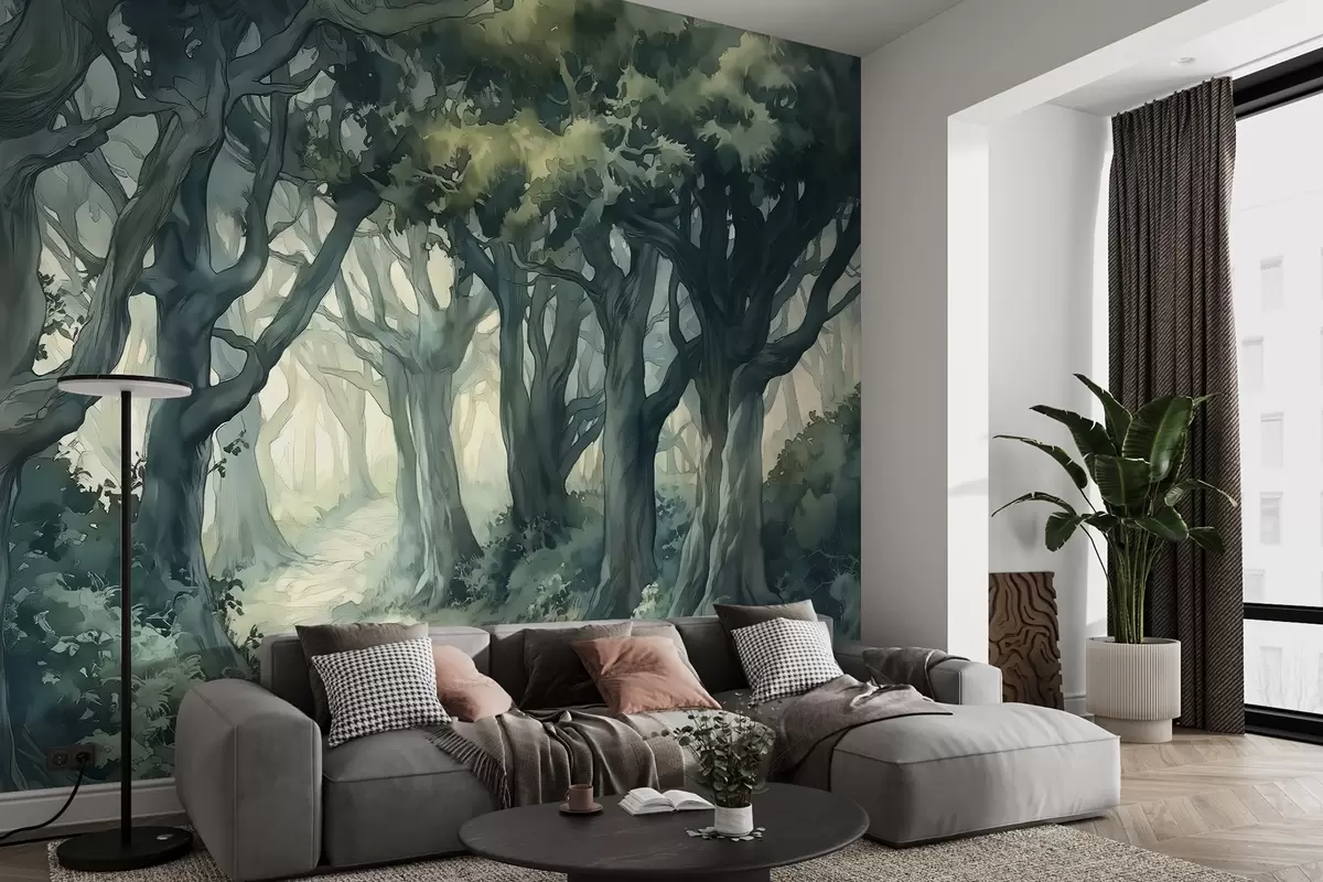 Fototapeta Las z dużymi drzewami, zielony kolor spallete, rysunek w stylu akwareli Nr w03150