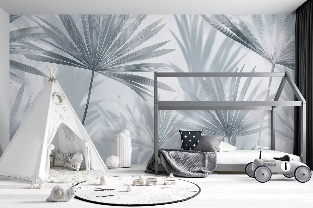 Fototapeta Liście palmowe, kwiatowy wzór, minimalizm, tropikalne, szare kolory Nr w03152v1