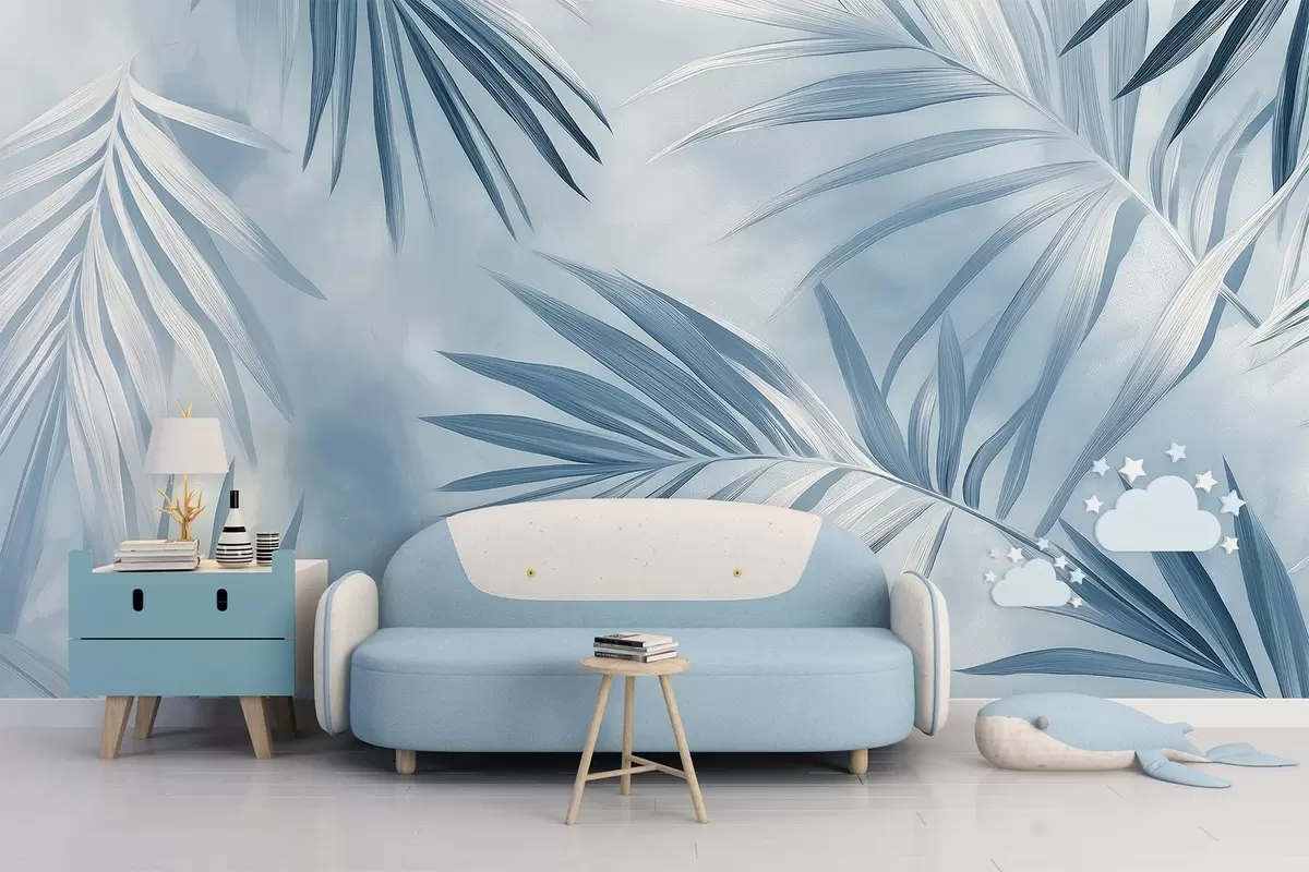 Fototapeta Abstrakcja tropikalnych liści, palma, niebieska paleta kolorów Nr w03153