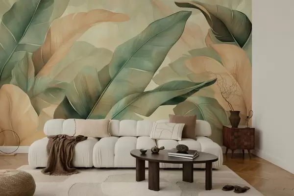 Fototapeta duże tropikalne liście w odcieniach zieleni i brzoskwini Nr w03286