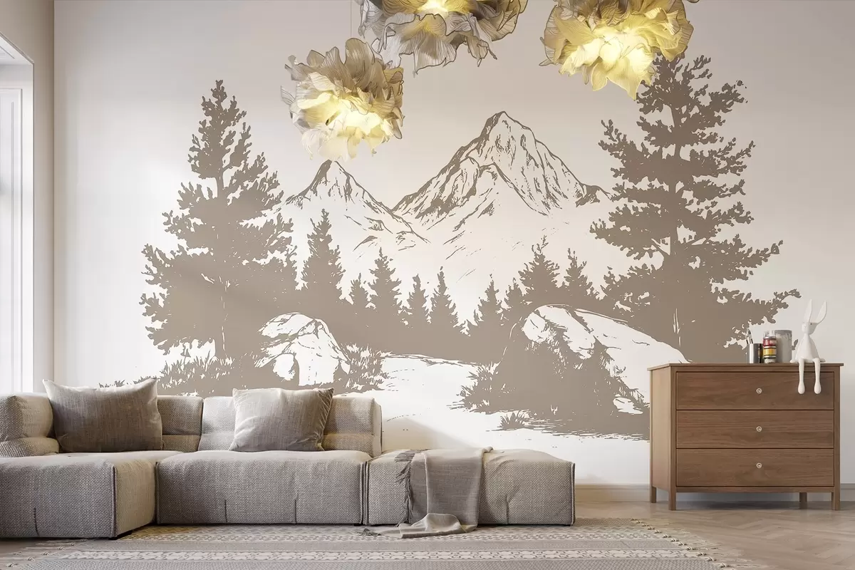 Fototapeta Alpy, góry z lasem, rysunek liniowy, kolor beżowy Nr w03342