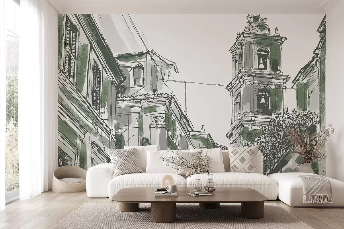 Fototapeta Śródziemnomorska ulica, kaplica, architektura, szare i zielone kolory Nr w03350v2