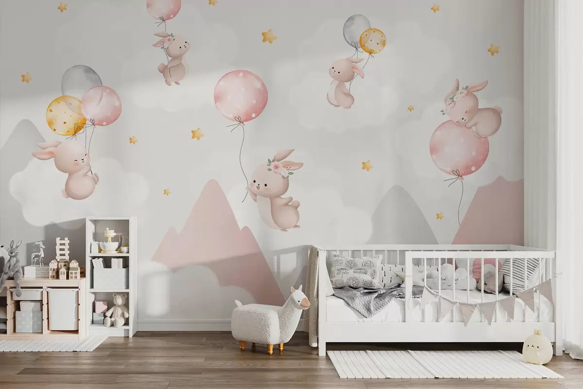 Fototapeta Króliczki z balonikami na chmurach wśród górskich szczytów Nr w03375