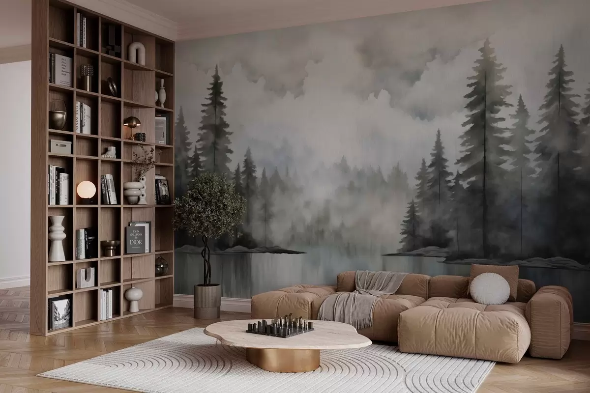 Fototapeta Las, jezioro i zachmurzone niebo w stylu akwareli Nr w03387