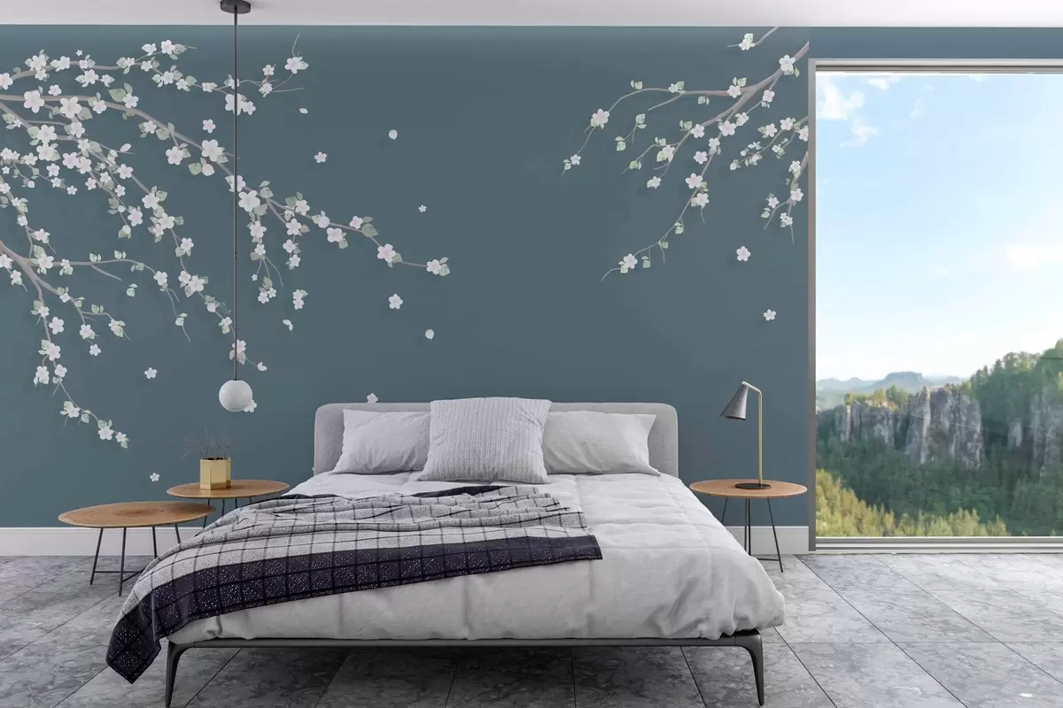 Fototapeta Kwitnąca gałąź na tle ściany w niebieskim stylu grunge Nr w03393v1