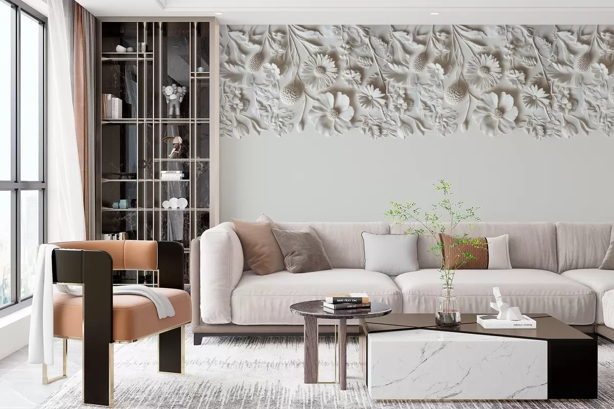 Fototapeta Imitacja płaskorzeźbionych kwiatów na górze w kolorze mlecznym Nr w03398v1