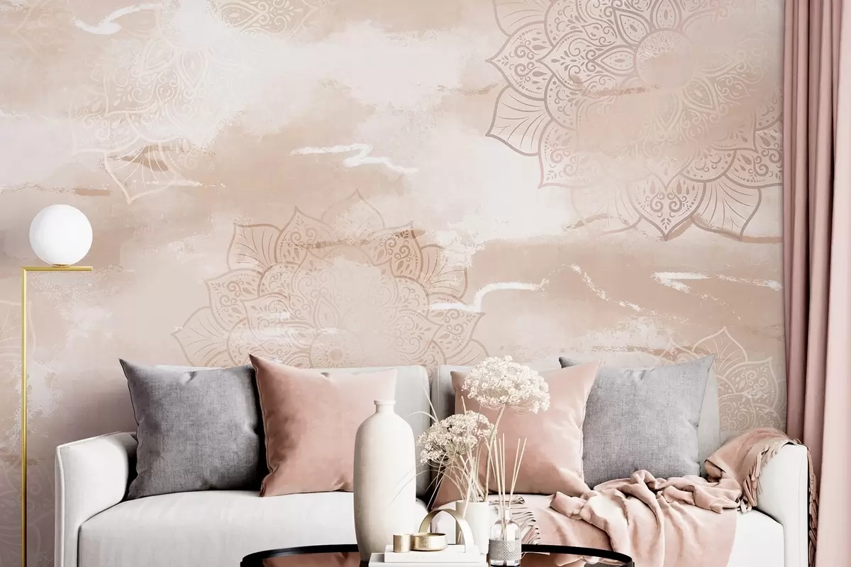 Fototapeta Mandale na pastelowym tle, żywe pociągnięcia pędzla, beżowe kolory Nr w03409