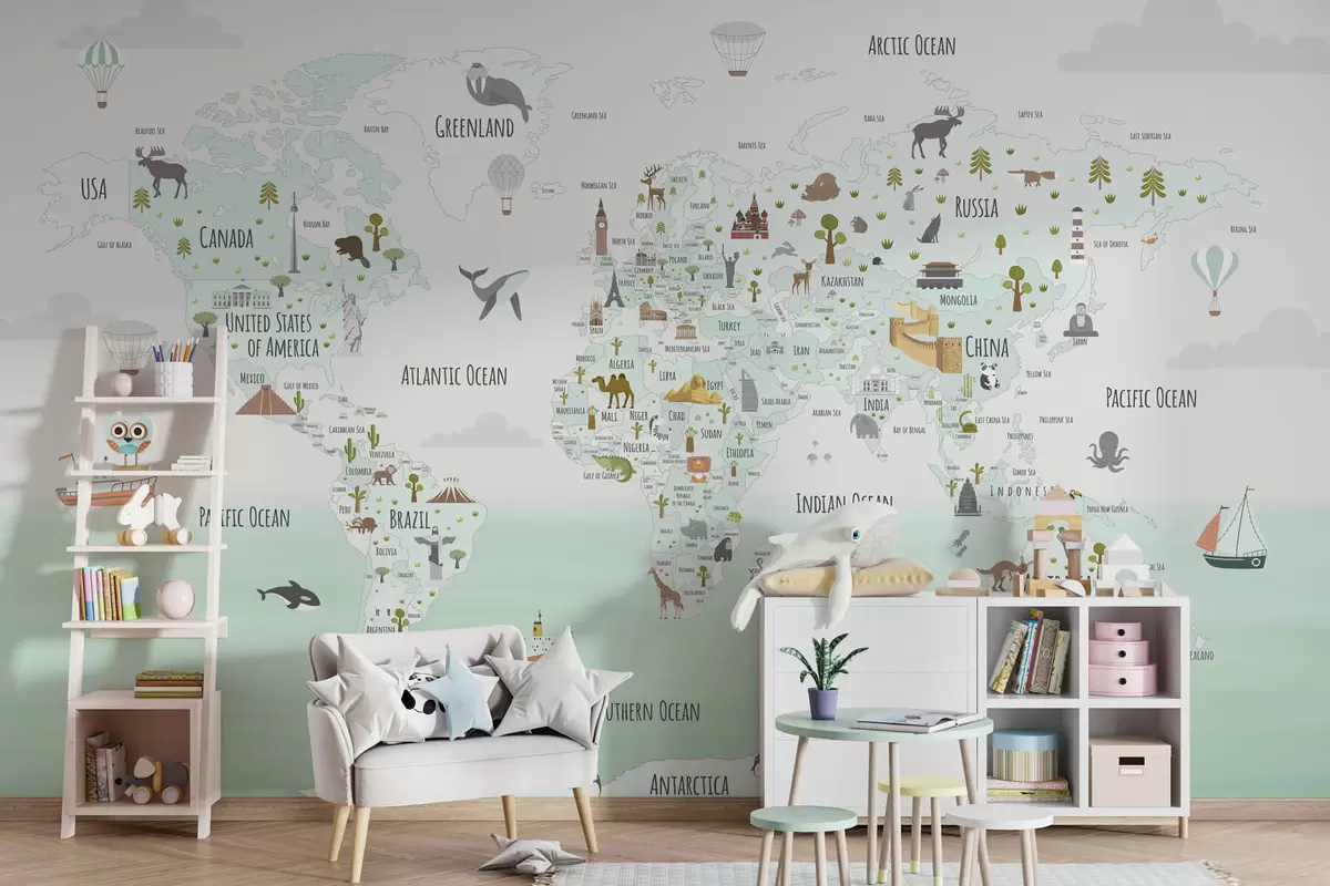 Fototapeta Mapa świata ze zwierzętami i punktami orientacyjnymi Nr w03410v2