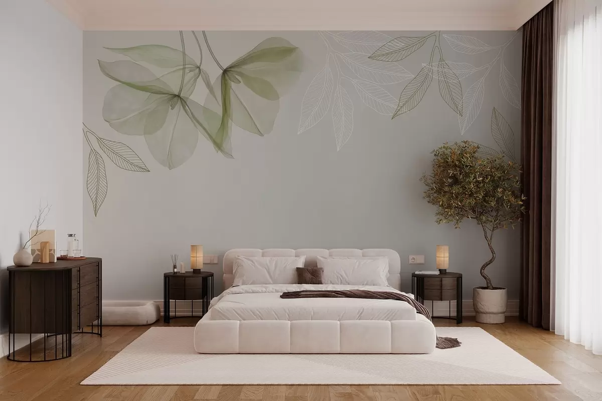Fototapeta delikatne półprzezroczyste kwiaty i liście w odcieniach khaki Nr w03616v2