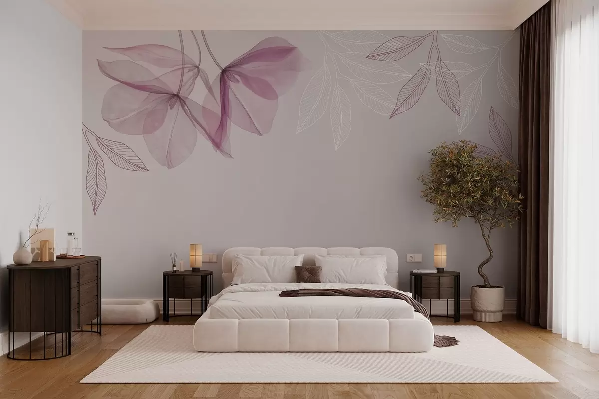 Fototapeta delikatne, półprzezroczyste kwiaty i liście w odcieniach fioletu Nr w03616v4