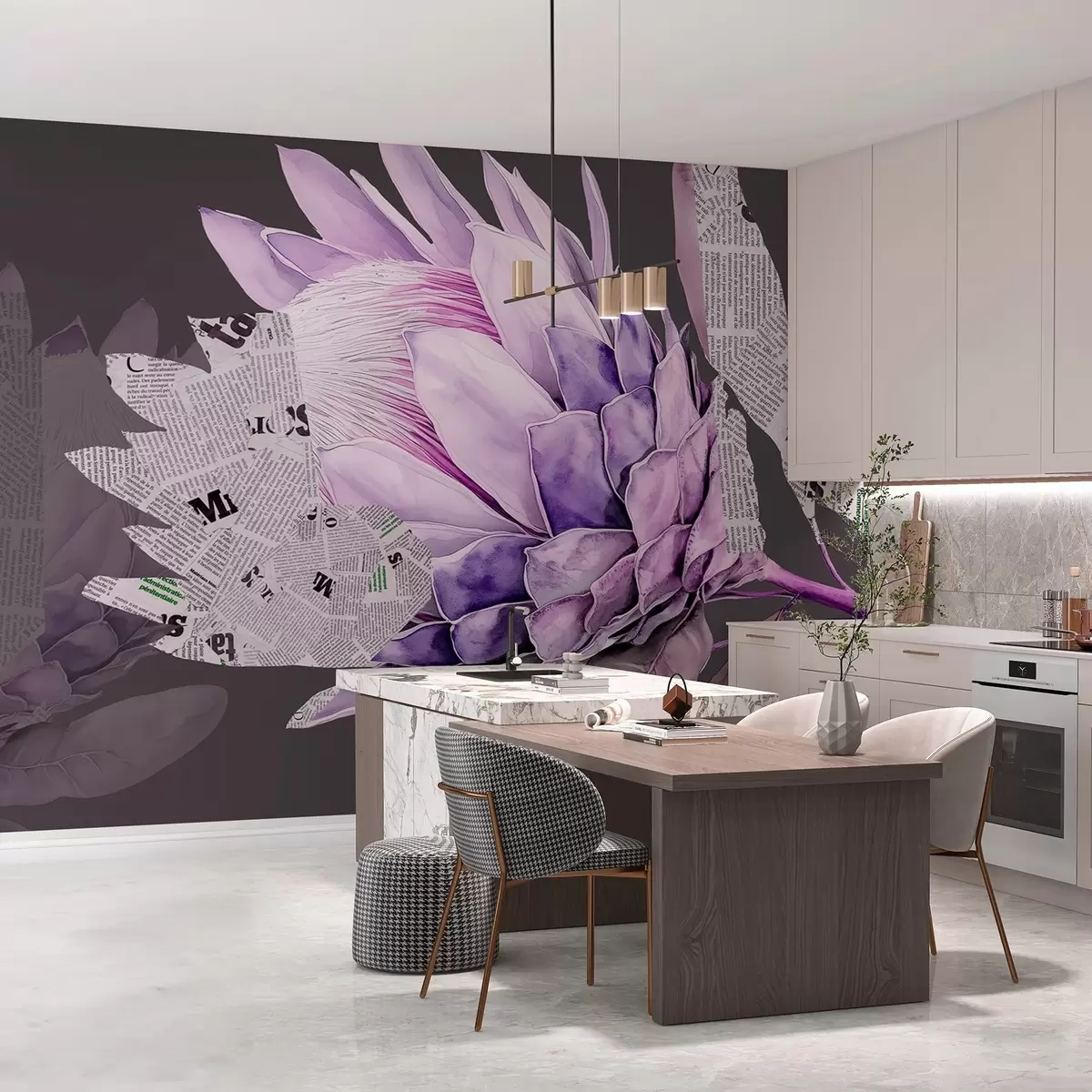 Fototapeta Kwiaty protea, grafika w gazecie, kwiatowy, tropikalny, ciemne tło, fioletowe kolory Nr w03667v2