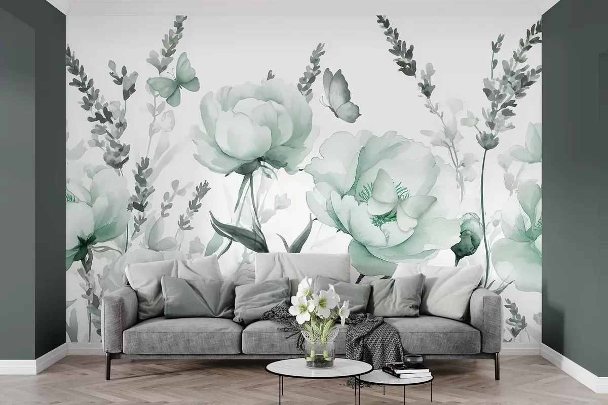 Fototapeta Kwiecista łąka, piwonie, lawenda, motyle, styl akwareli, zielone kolory Nr w03668v1
