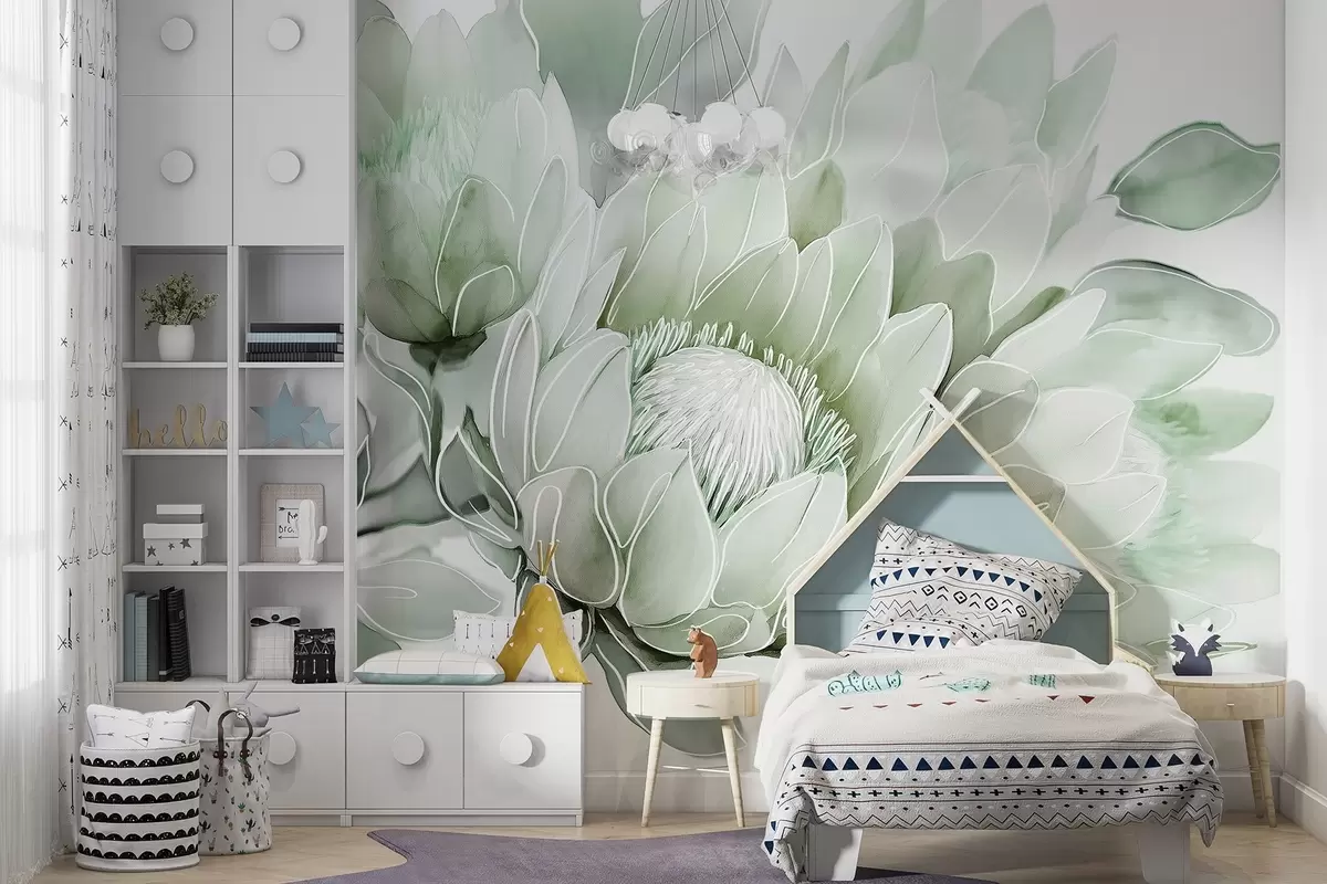 Fototapeta Piękne kwiaty protea, rysunek liniowy, tropikalne, zielone kolory Nr w03669v2