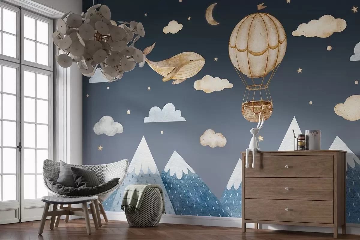 Fototapeta Balon powietrzny, uroczy wieloryb, ciemne rozgwieżdżone niebo, góry, akwarela, kolory niebieski i beżowy Nr w03672v1