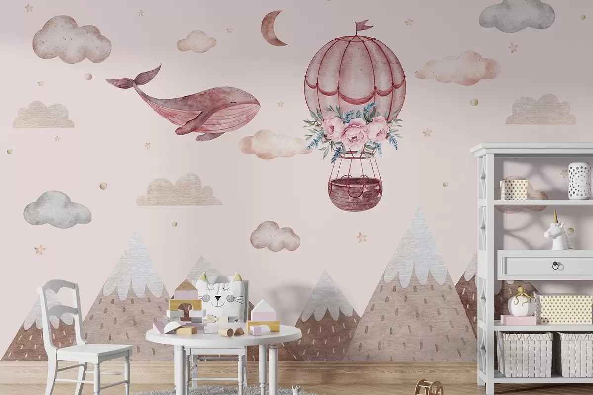 Fototapeta Śliczny wieloryb z balonem, niebo z chmurami, góry, styl akwareli, różowe kolory Nr w03673
