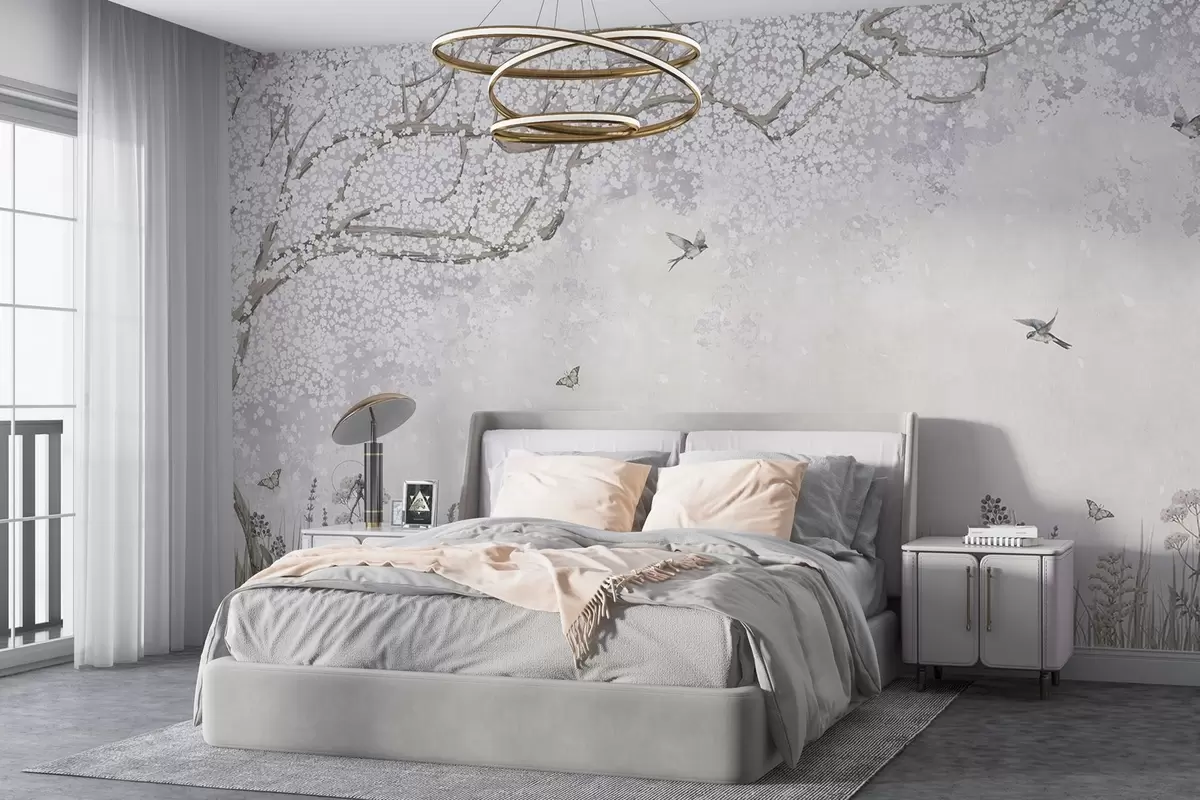 Fototapeta Kwitnące drzewo z polnymi kwiatami i ptakami Nr w03700