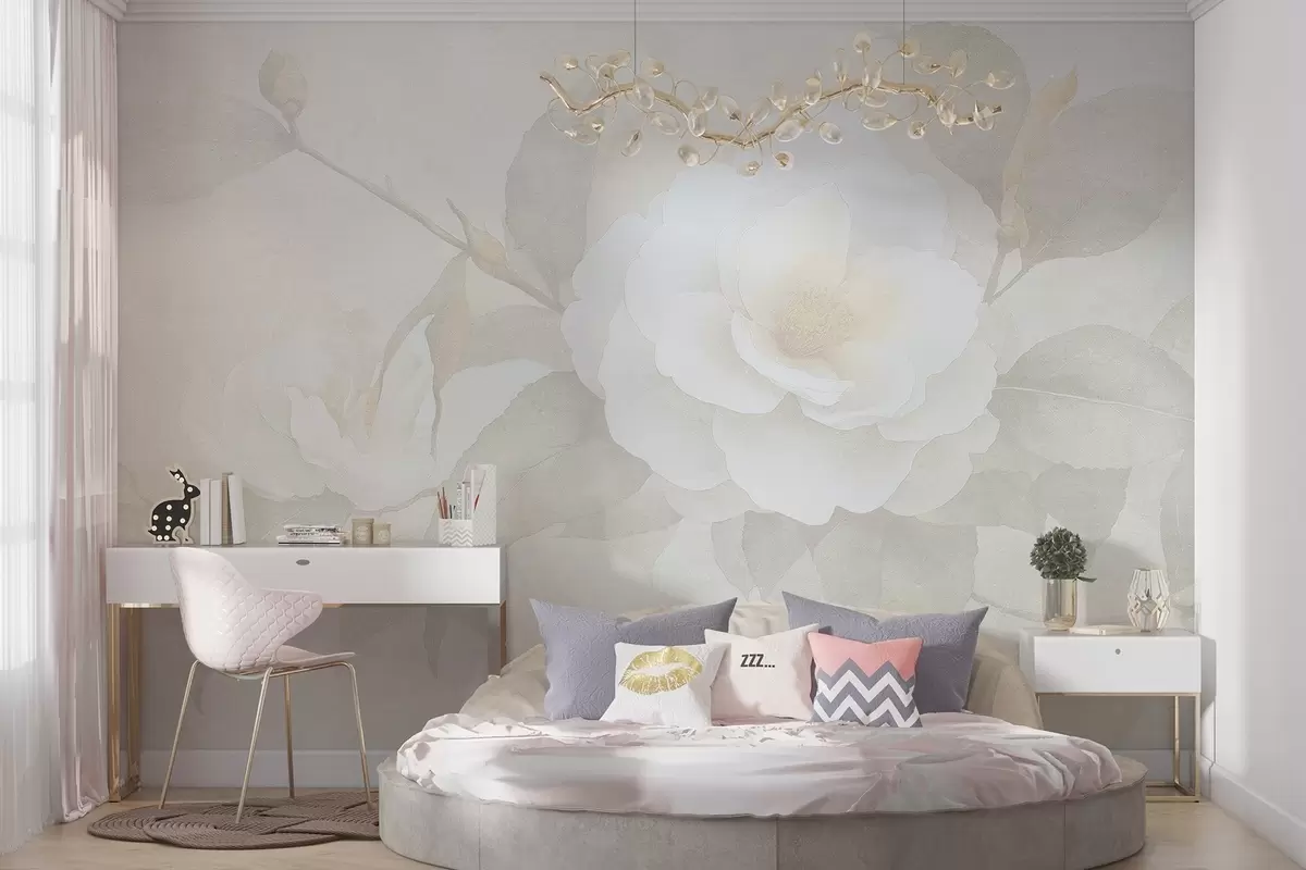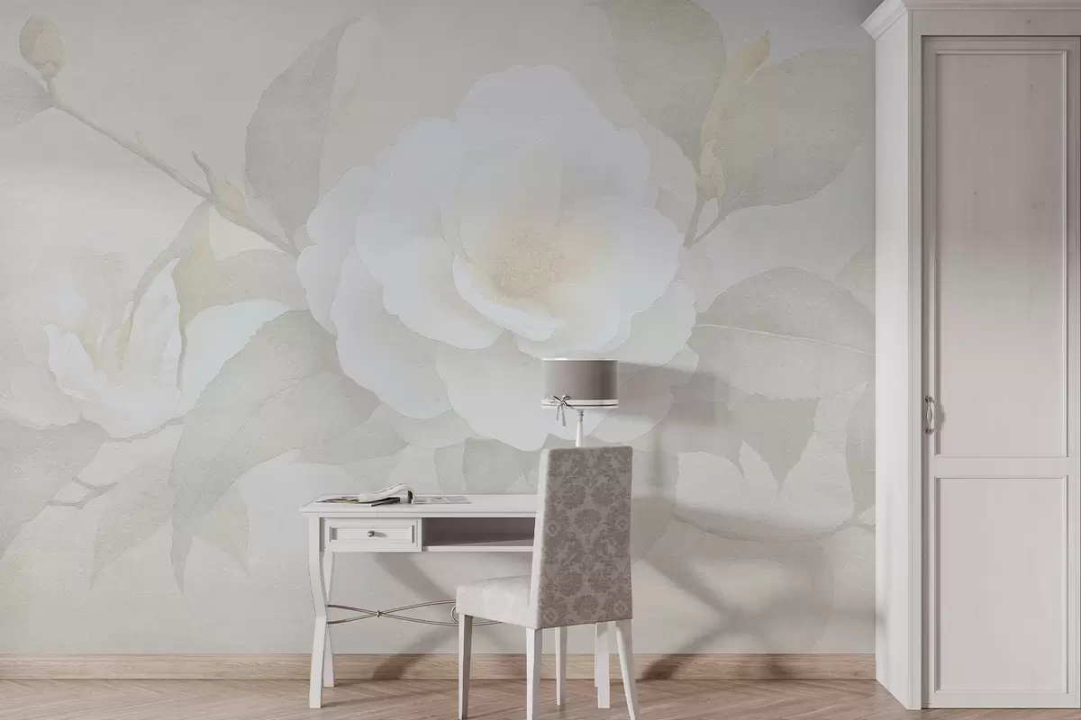 Fototapeta Delikatny pastel z kwiatami kamelii na gałęzi, beżowe kolory Nr w03760