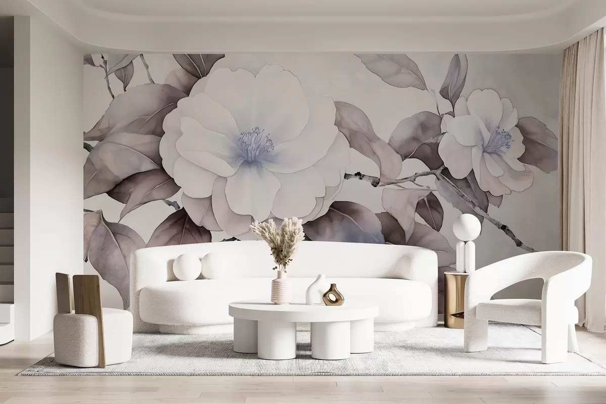 Fototapeta Kwiaty kamelii w stylu akwareli na gałęzi, fioletowe kolory Nr w03761v1