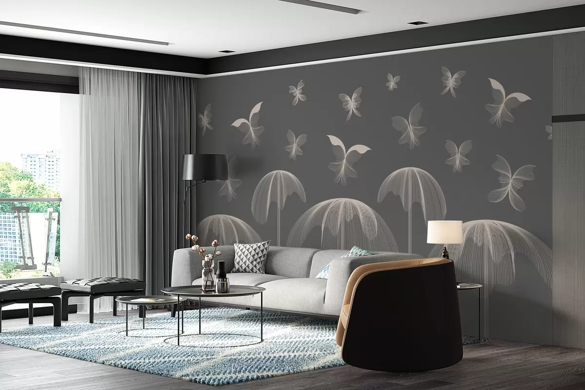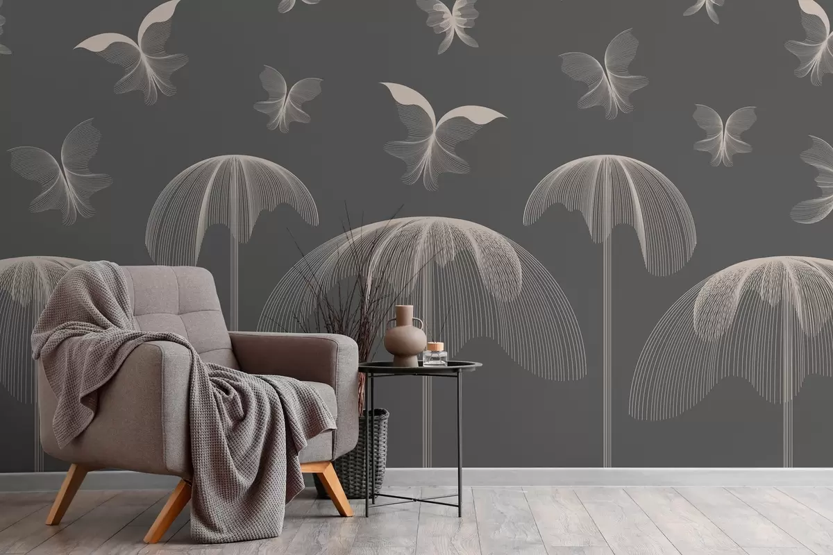 Fototapeta minimalistyczna liniowa tapeta motyle i fontanny na ciemnoszarym tle Nr w03762v1