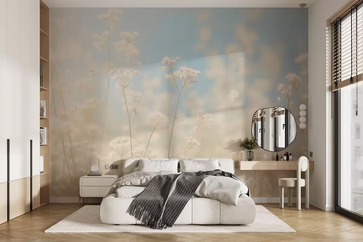 Fototapeta Delikatne pole suszonych kwiatów w rozmytym świetle słonecznym Nr w03801