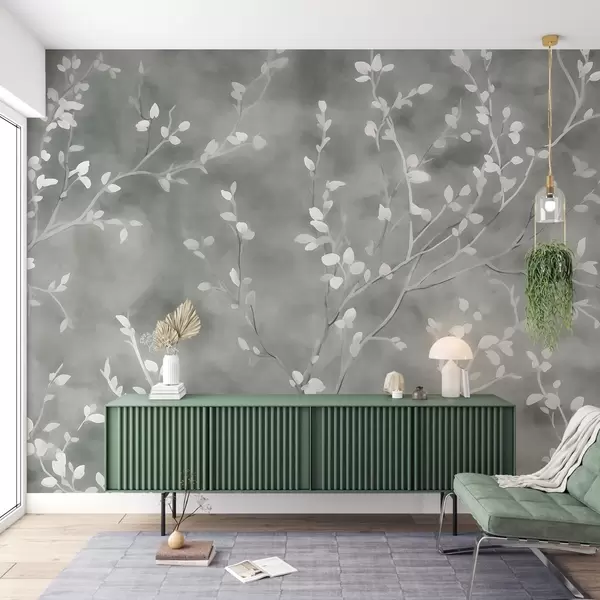 Fototapeta minimalistyczny, ręcznie malowany wzór tapety z miękkimi białymi gałęziami drzew z delikatnymi liśćmi, organicznie rozgałęziającymi się na stonowanym szałwiowym zielonym tle, drobna botaniczna linia w naturalnym przepływie Nr w03949v2