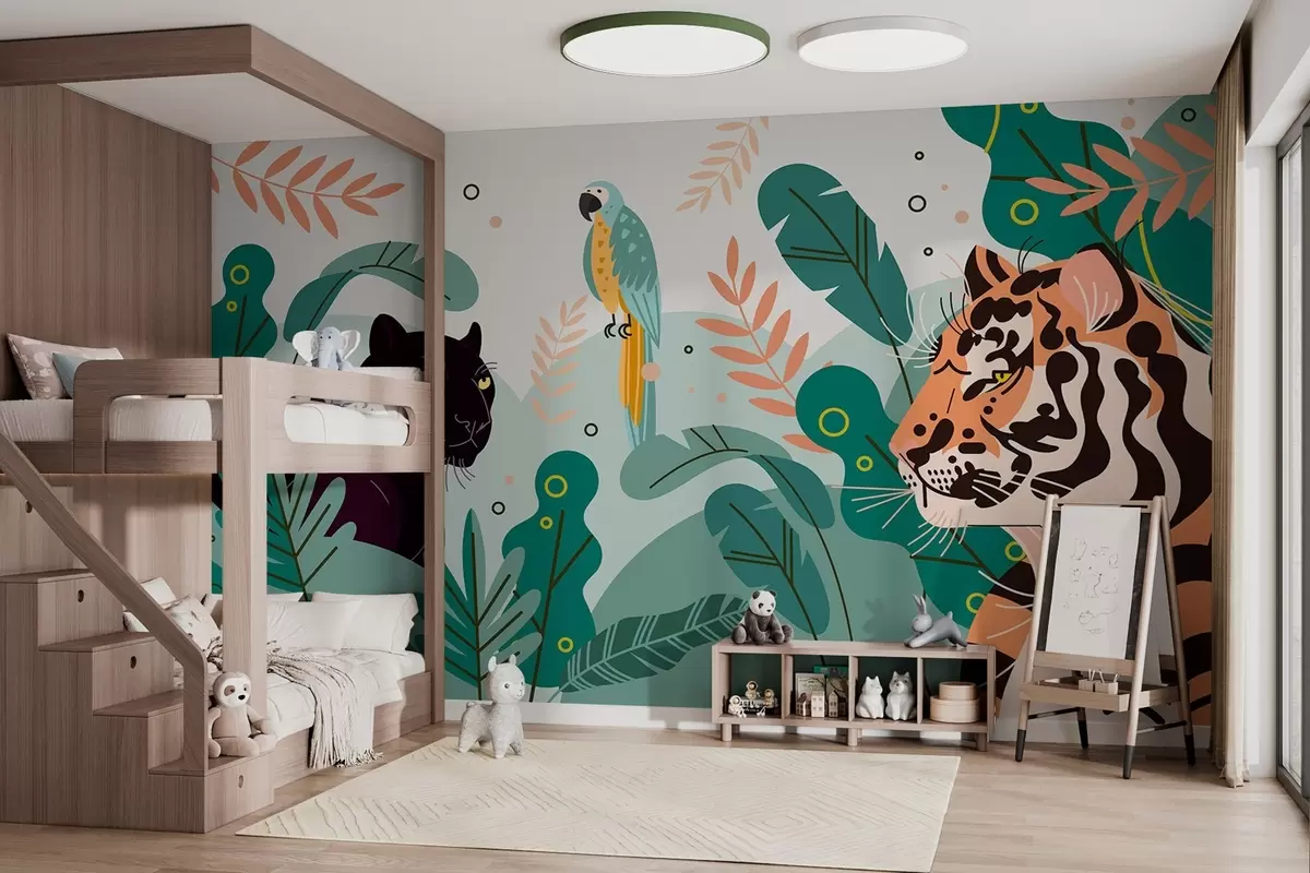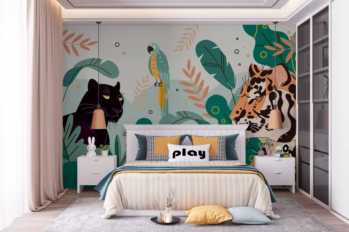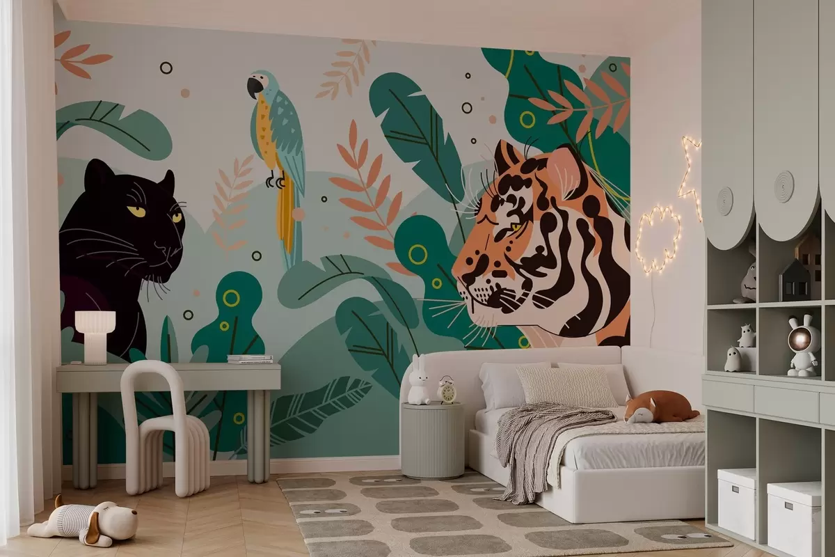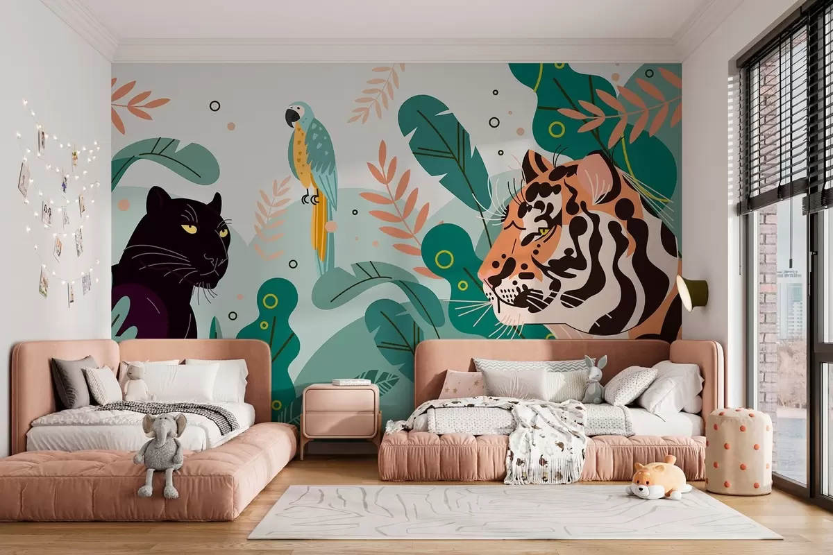Fototapeta dżungla z tygrysem, panterą i papugą Nr w03958