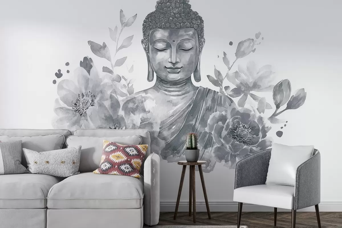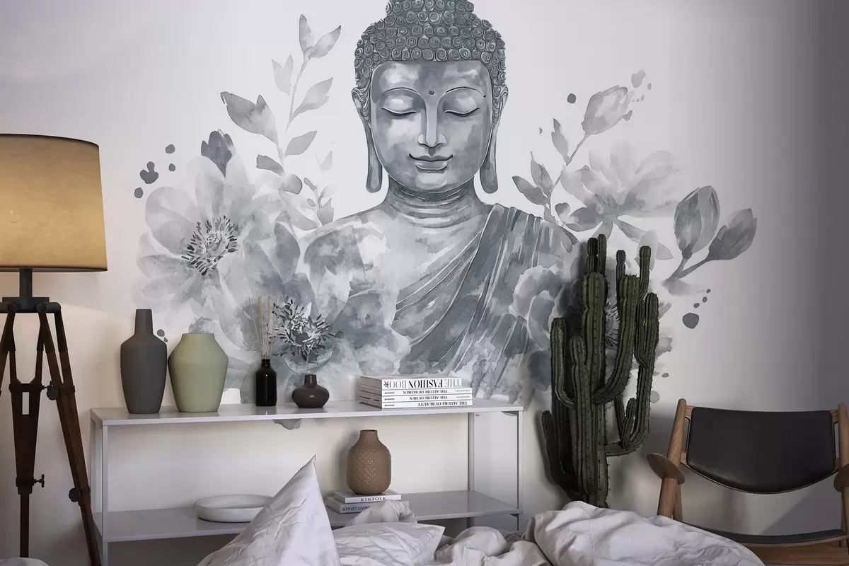 Fototapeta Akwarela Budda z kwiatami, duchowa, szara paleta kolorów Nr w04005v1