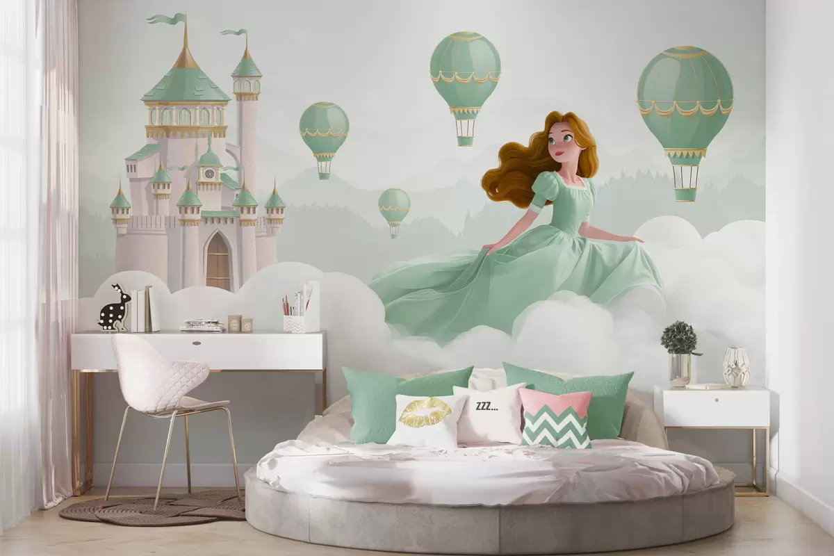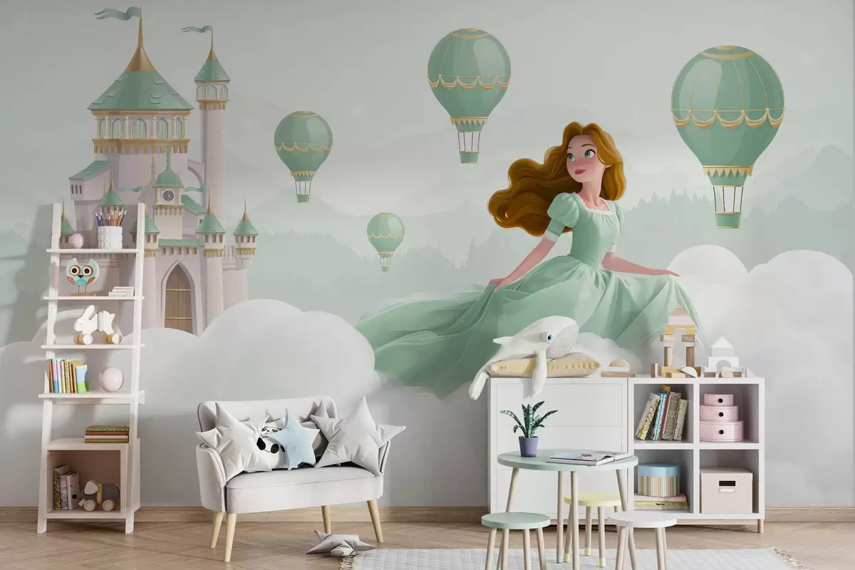 Fototapeta Księżniczka wśród chmur na tle krajobrazu z zamkiem Nr w04015v2