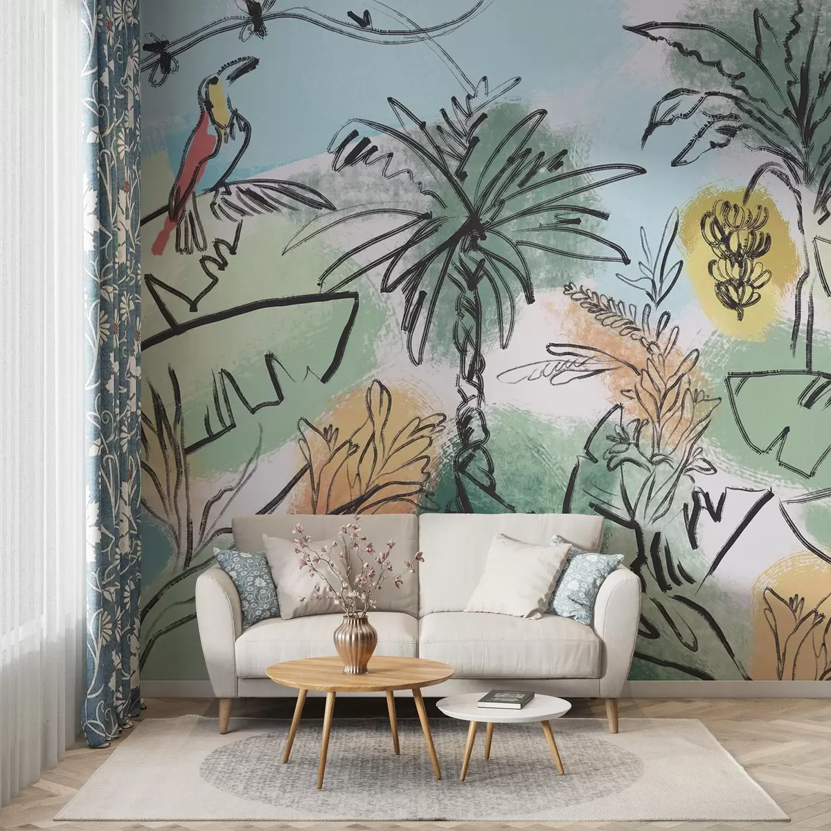 Fototapeta Tropikalny nadruk z papugami, bogata kolorystyka, tropiki Nr w04019