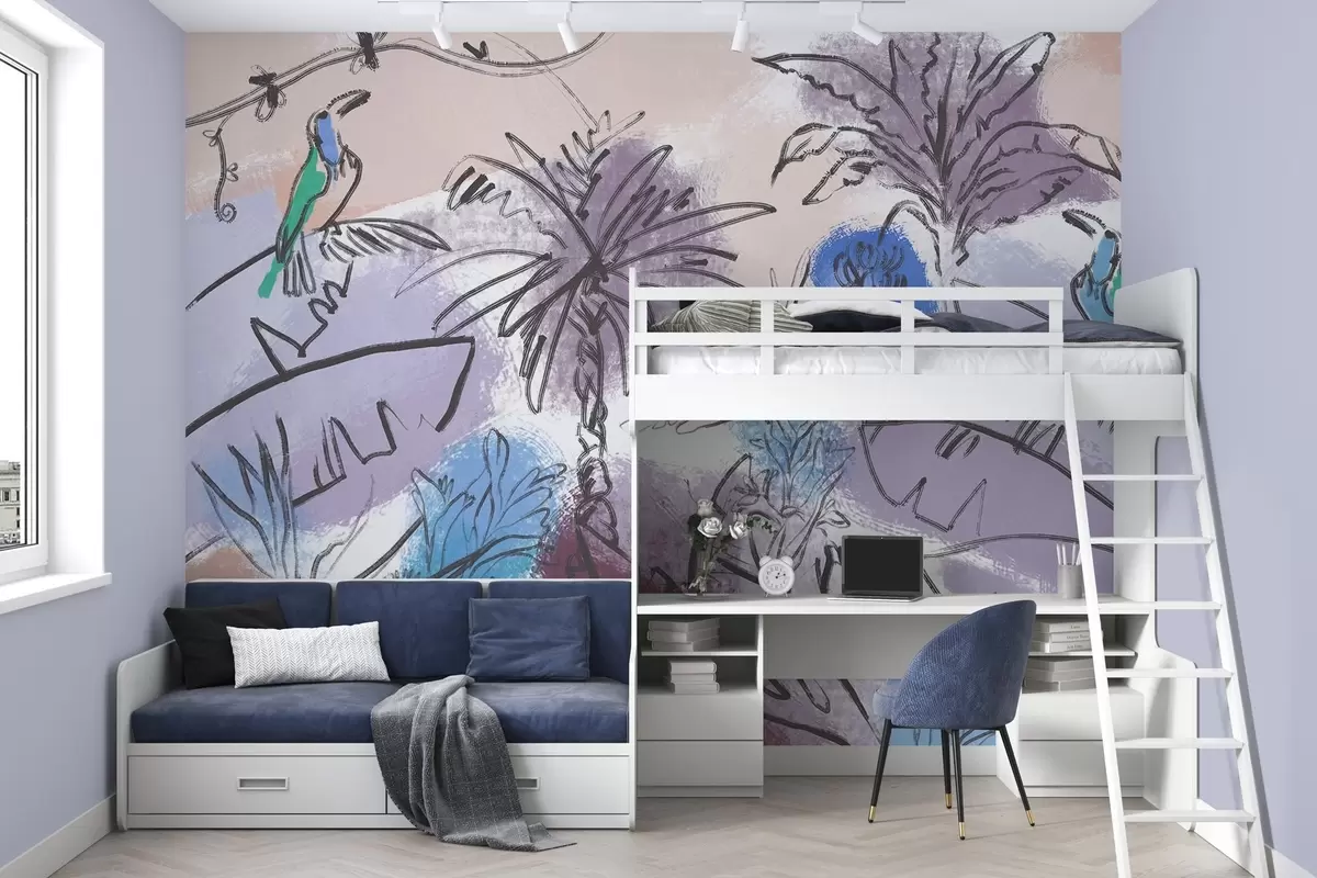 Fototapeta Tropikalny nadruk z niebieskimi kwiatami i malowniczymi papugami Nr w04019v2
