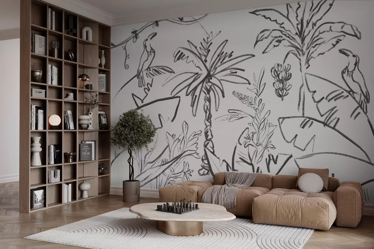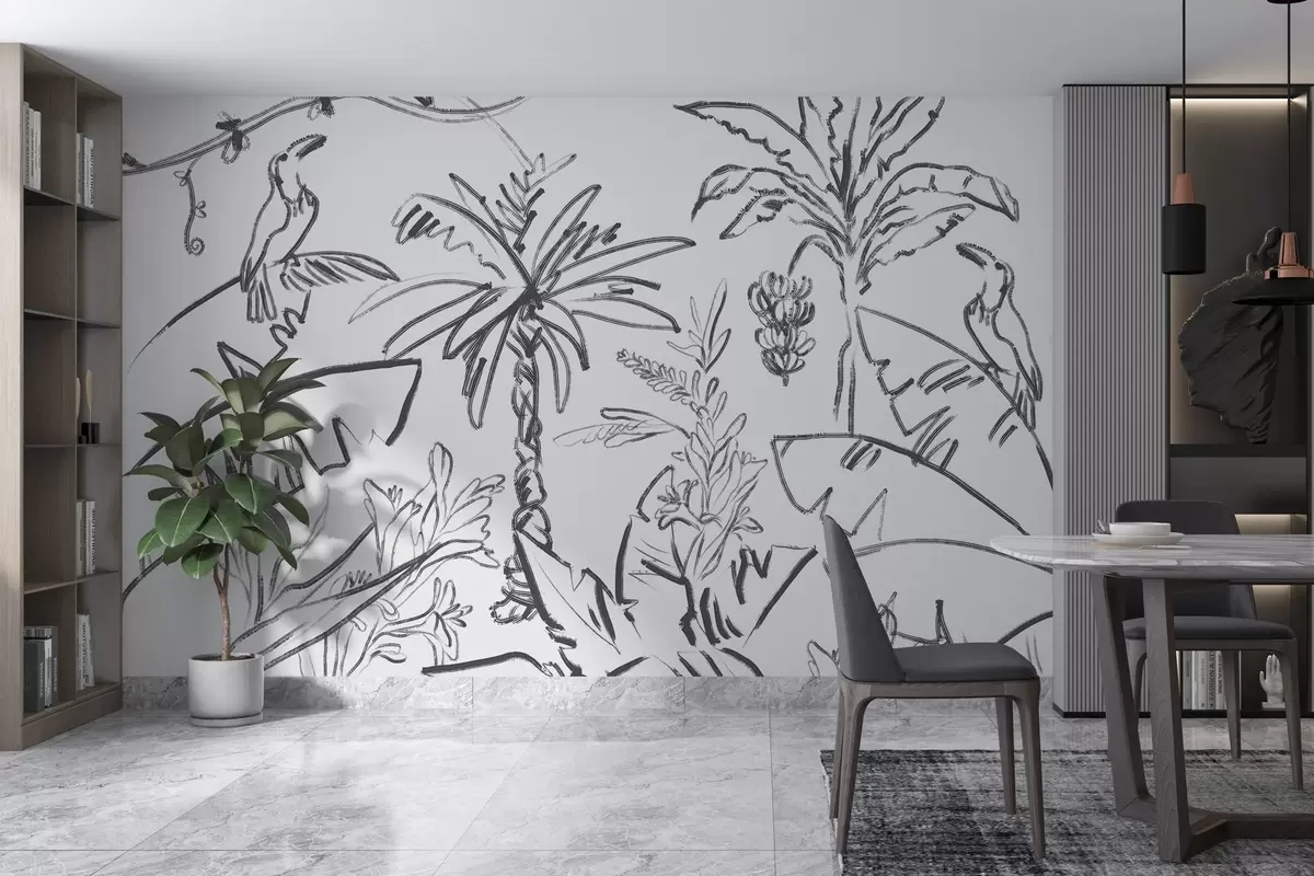 Fototapeta Tropikalny rysunek liniowy, banany, palmy, grafika konturowa Nr w04020