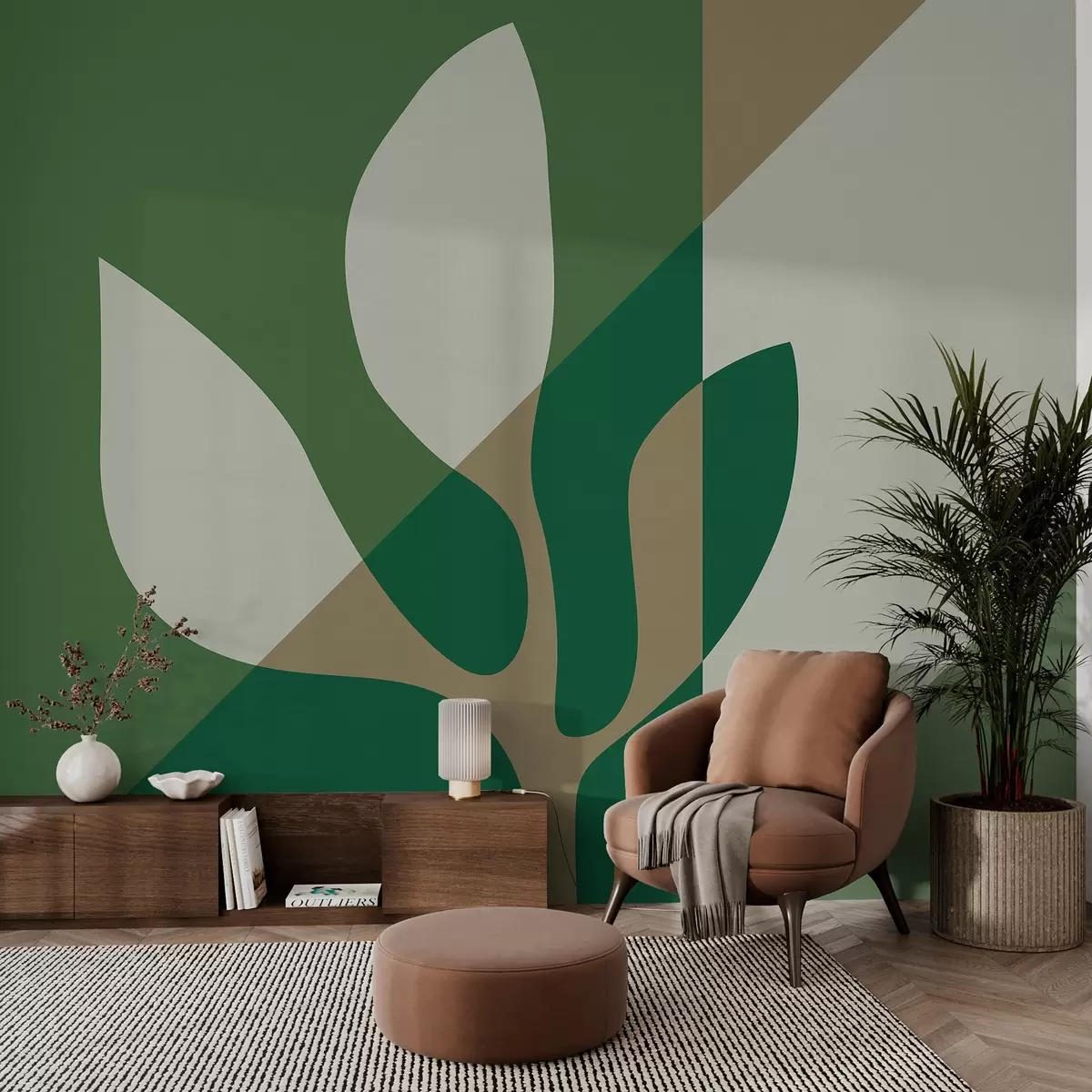Fototapeta abstrakcyjna grafika rośliny na tle geometrii w kolorach zieleni i ochry Nr w04028