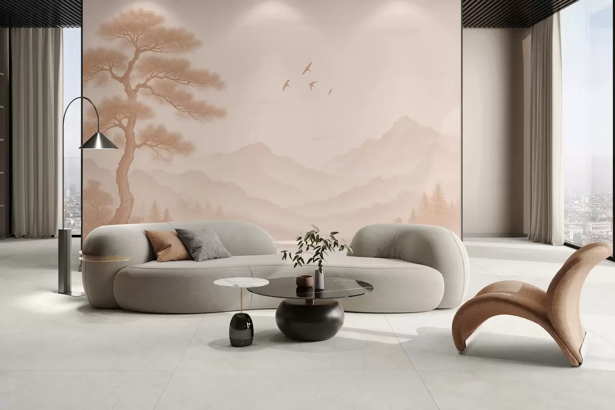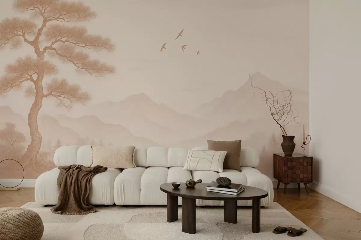 Fototapeta panorama wzgórz z dużym drzewem w odcieniach mokki Nr w04033v1