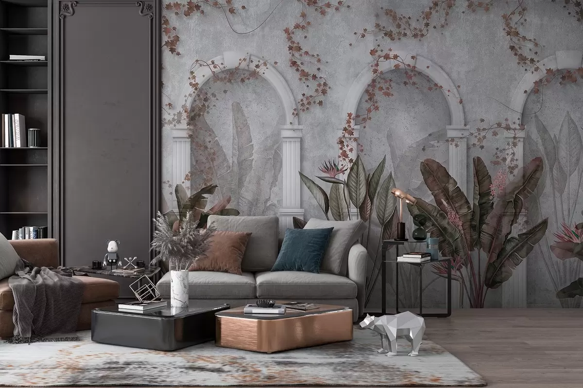 Fototapeta Betonowa ściana z łukami i tropikalnymi roślinami, kwiatowe, bordowe kolory Nr w04065v1