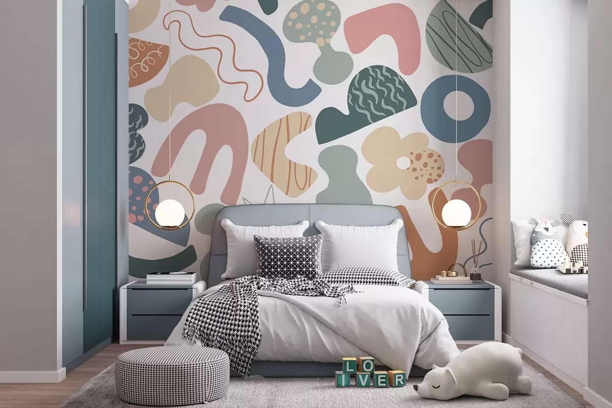 Fototapeta Figury geometryczne z rysunkiem bazgrołów, młodzieńczy, zielony, różowy, niebieski Nr w04068v2