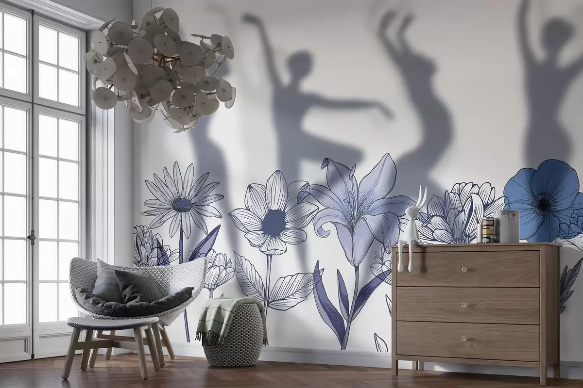 Fototapeta Sylwetki baletnic, rustykalne kwiaty, grafika liniowa, niebieskie kolory Nr w04069v3