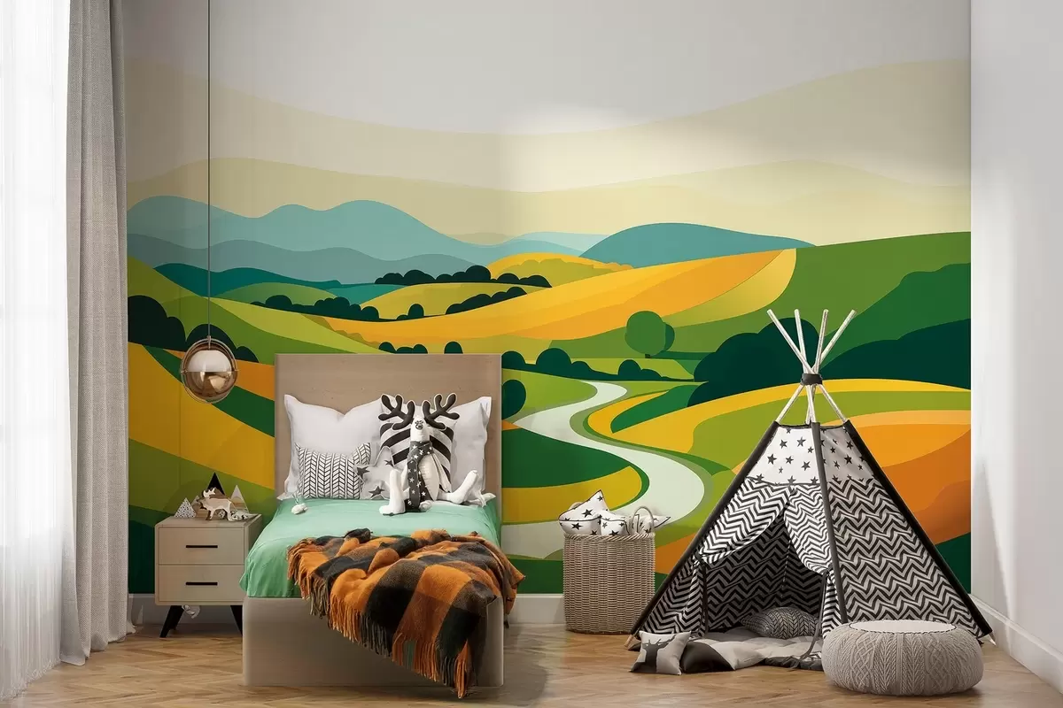 Fototapeta Abstrakcyjny krajobraz ze wzgórzami i drzewami, żywe kolory Nr w04116