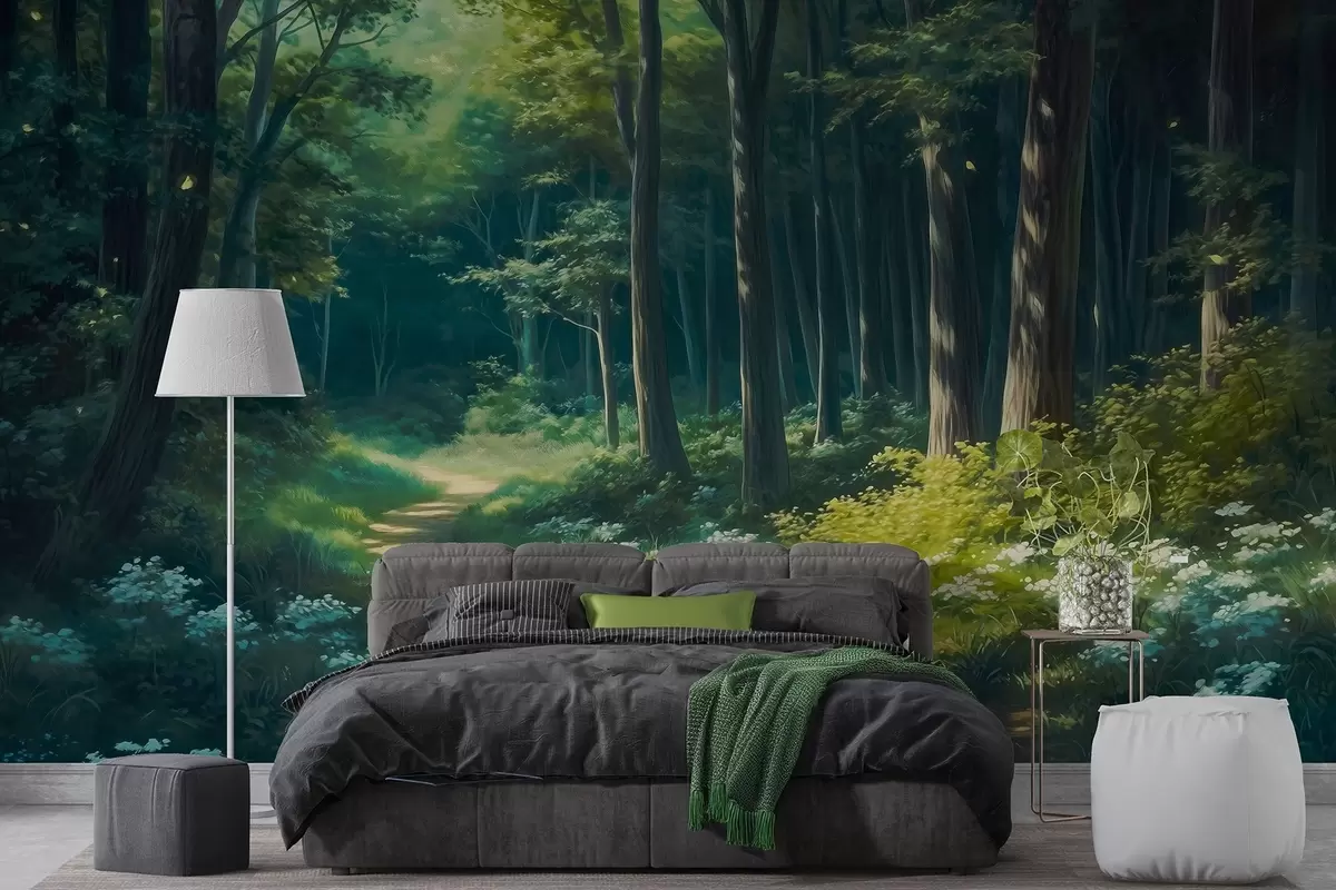Fototapeta Zielony las z delikatnym światłem słonecznym, drzewami i białymi kwiatami, rysunek olejny Nr w04118