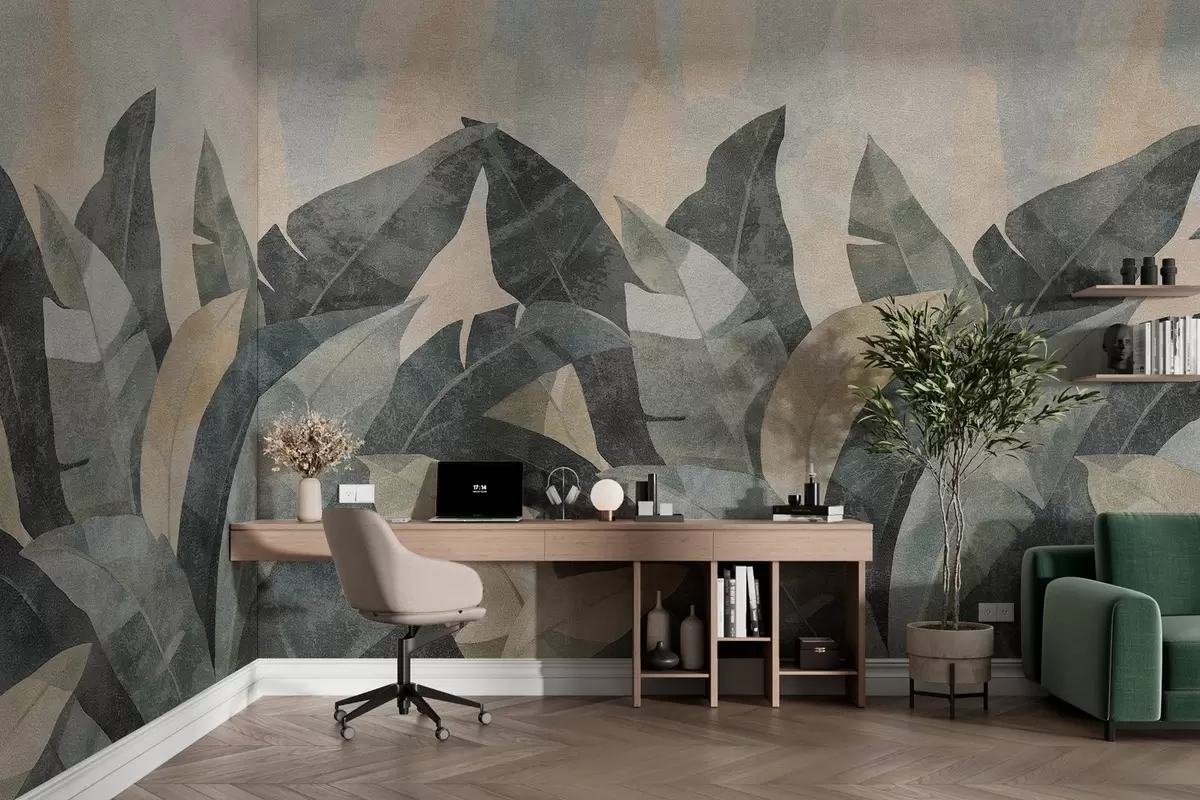 Fototapeta teksturowane liście bananowca w naturalnych odcieniach beżu, zieleni i szarości Nr w04285