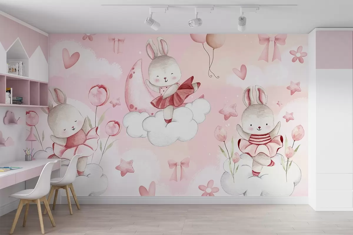 Fototapeta Króliki w różowych sukienkach baletowych na chmurach Nr w04333