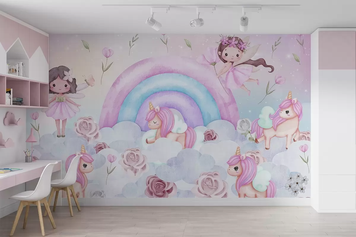 Fototapeta Wróżki i jednorożce wśród chmur i tęczy Nr w04371