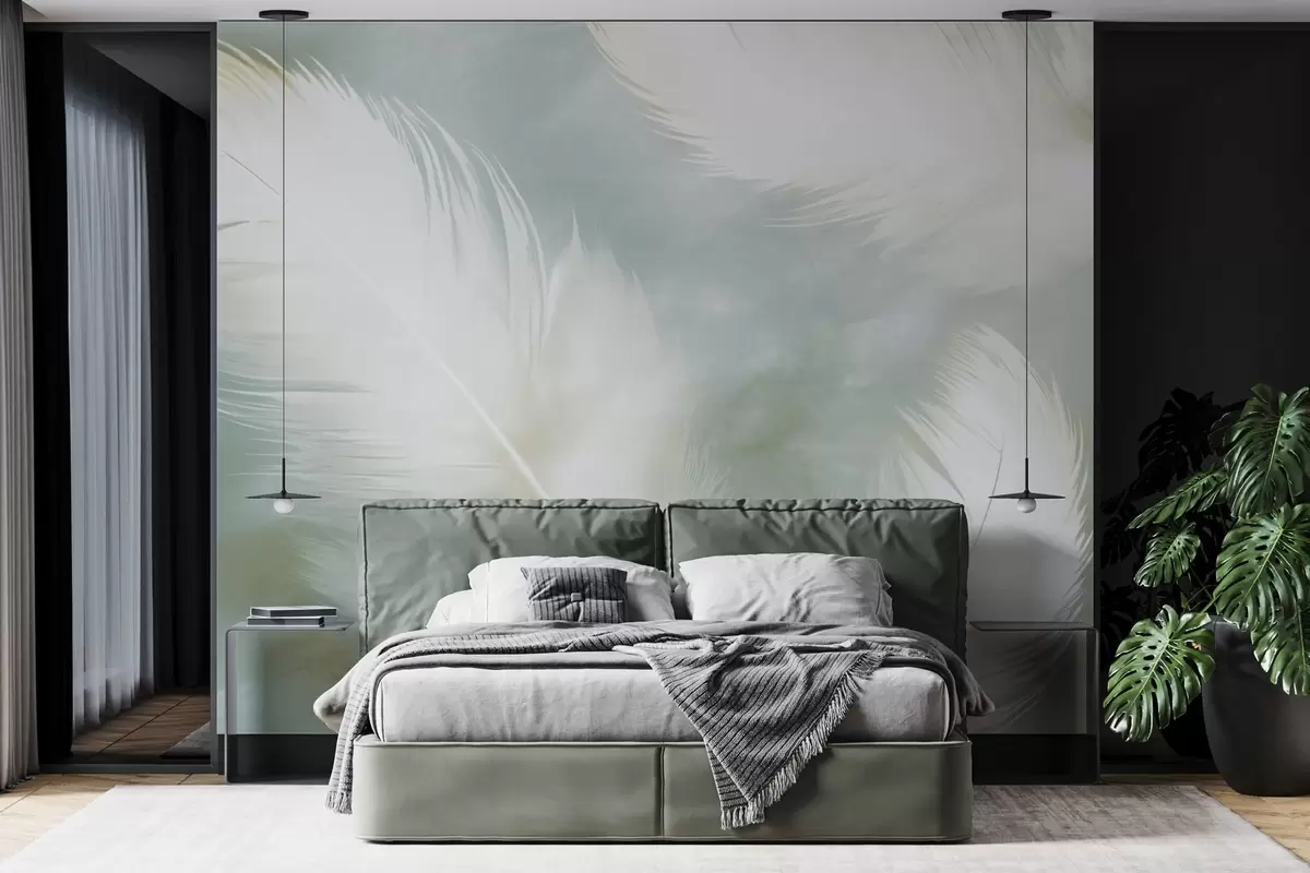 Fototapeta Delikatne białe pióra na miękkim miętowym tle Nr w04399