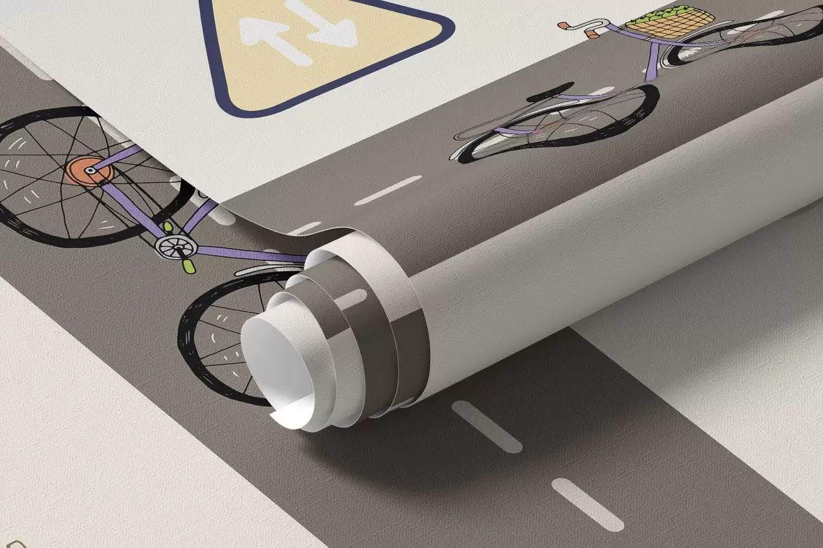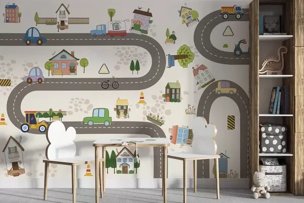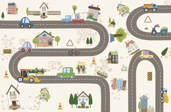 Fototapeta Droga dla dzieci z samochodami i kolorowymi domkami Nr w04404